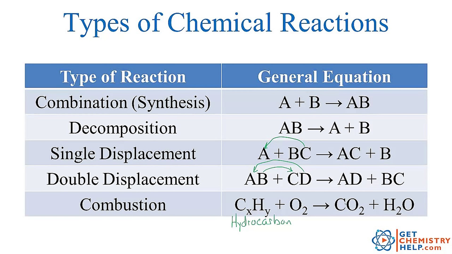 Mrs. Karle's Science Class: Chapter 14: Chemical Reactions from www.thoughtco.com Roll over or tap the equation for the answer. Types of chemical reactions 1 if you add two substances together sometimes you get a chemical reaction. We'll learn about the five major types of chemical reactions: Having a thorough understanding of these types of reactions will be. Classify chemical reactions as one of these three types given appropriate descriptions or chemical equations. A simple way of classifying chemical reactions is to group them in one of four basic types: Single replacement (or substitution or displacement) reactions. Reaction in which a single reactant decompose to give two or more products.