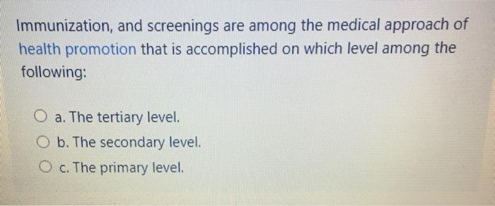 Vaccinations Are A Primary Secondary Or Tertiary Approach To Health Promotion : - The term health promotion was revisited in 1986, in the ottawa charter for health promotion where it is defined as 'the process of enabling people to increase control prevention is frequently categorised as primary, secondary, and tertiary prevention;. And not just a vaccine against the killer germ dirnhofer was a member of the institute for biomedical aging research of the austrian academy of sciences. The australian health care system & primary health care kate russo. Discover the meaning of primary, secondary, tertiary, and quaternary care in medicine. Health promotion has been described by the world health organization (who) as the process of enabling people to increase control over and improve 1. Health promotion (health interventions, lifestyle modifications).